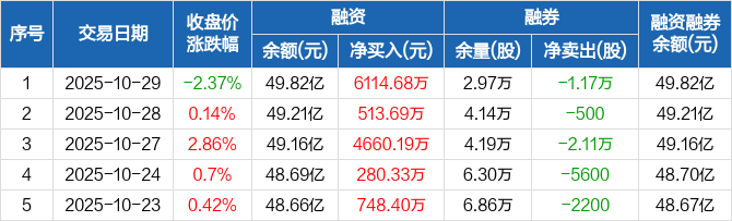 融资方面,当日融资买入2.61亿元,融资偿还2亿元,融资净买入6114.68万元,连续5日净买入累计1.23亿元。融券方面,融券卖出1000股,融券偿还1.27万股,融券余量2.97万股,融券余额42.77万元。融资融券余额合计49.82亿元。