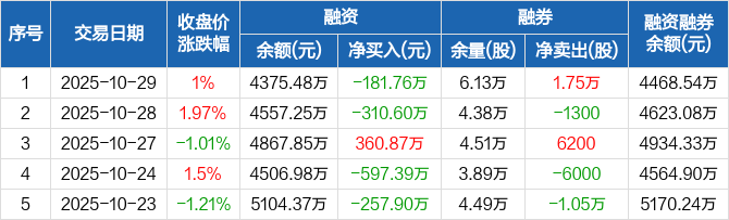 融资方面,当日融资买入644.64万元,融资偿还826.4万元,融资净偿还181.76万元。融券方面,融券卖出2.76万股,融券偿还1.01万股,融券余量6.13万股,融券余额93.05万元。融资融券余额合计4468.54万元。