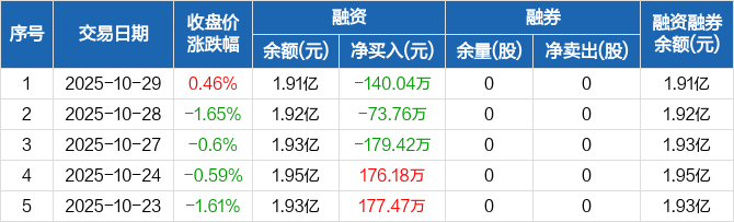 融资方面,当日融资买入1200.97万元,融资偿还1341.02万元,融资净偿还140.04万元,连续3日净偿还累计393.22万元。融券方面,融券卖出0股,融券偿还0股,融券余量0股,融券余额0元。融资融券余额合计1.91亿元。