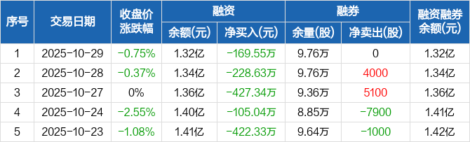 红豆股份融资融券信息显示,2025年10月29日融资净偿还169.55万元;融资余额1.32亿元,创近一年新低,较前一日下降1.27%。