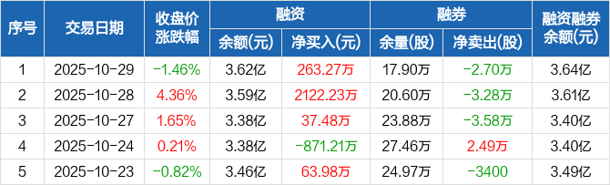 融资方面,当日融资买入4585.09万元,融资偿还4321.82万元,融资净买入263.27万元,连续3日净买入累计2422.97万元。融券方面,融券卖出1500股,融券偿还2.85万股,融券余量17.9万股,融券余额181.51万元。融资融券余额合计3.64亿元。