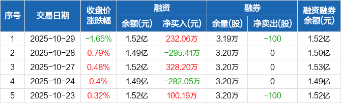 融资方面,当日融资买入682.99万元,融资偿还450.94万元,融资净买入232.06万元。融券方面,融券卖出0股,融券偿还100股,融券余量3.19万股,融券余额39.94万元。融资融券余额合计1.52亿元。