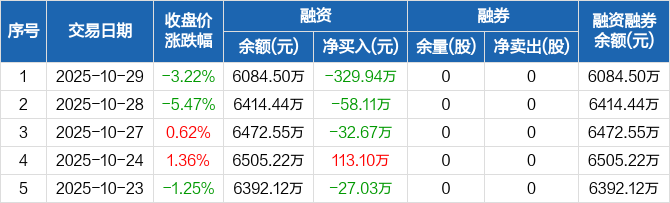 融资方面,当日融资买入609.03万元,融资偿还938.97万元,融资净偿还329.94万元,连续3日净偿还累计420.72万元。融券方面,融券卖出0股,融券偿还0股,融券余量0股,融券余额0元。融资融券余额合计6084.5万元。