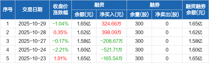 融资方面,当日融资买入521.35万元,融资偿还196.69万元,融资净买入324.66万元。融券方面,融券卖出0股,融券偿还0股,融券余量300股,融券余额1707元。融资融券余额合计1.65亿元。