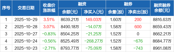 融资方面,当日融资买入968.65万元,融资偿还819.61万元,融资净买入149.03万元。融券方面,融券卖出200股,融券偿还0股,融券余量1.6万股,融券余额177.42万元。融资融券余额合计8816.63万元。