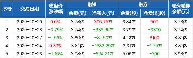 融资方面,当日融资买入1305.97万元,融资偿还909.22万元,融资净买入396.75万元。融券方面,融券卖出4100股,融券偿还3600股,融券余量3.84万股,融券余额19.32万元。融资融券余额合计3.78亿元。