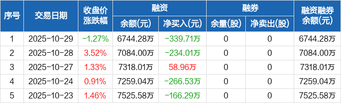 融资方面,当日融资买入375.21万元,融资偿还714.92万元,融资净偿还339.71万元。融券方面,融券卖出0股,融券偿还0股,融券余量0股,融券余额0元。融资融券余额合计6744.28万元。