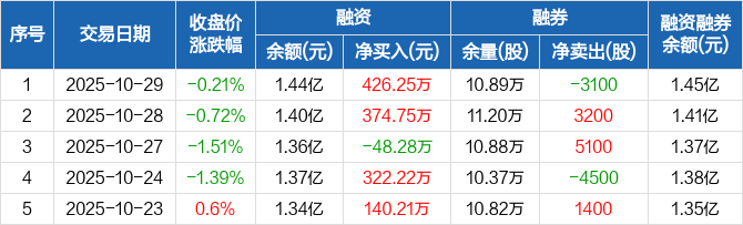 融资方面,当日融资买入862.12万元,融资偿还435.87万元,融资净买入426.25万元。融券方面,融券卖出0股,融券偿还3100股,融券余量10.89万股,融券余额105.42万元。融资融券余额合计1.45亿元。