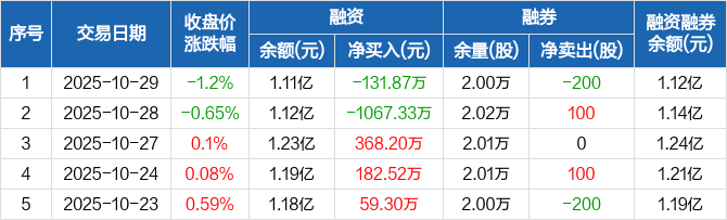 融资方面,当日融资买入448.04万元,融资偿还579.92万元,融资净偿还131.87万元。融券方面,融券卖出0股,融券偿还200股,融券余量2万股,融券余额117.24万元。融资融券余额合计1.12亿元。