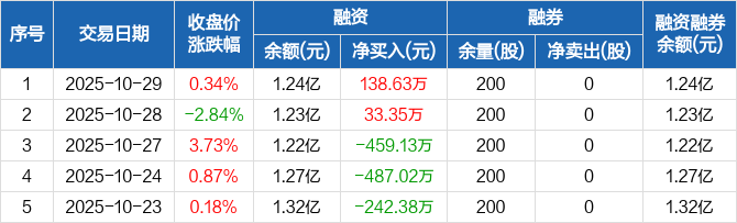 融资方面,当日融资买入2059.56万元,融资偿还1920.93万元,融资净买入138.63万元。融券方面,融券卖出0股,融券偿还0股,融券余量200股,融券余额2334元。融资融券余额合计1.24亿元。