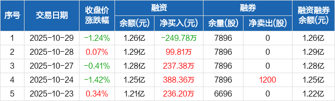 融资方面,当日融资买入656.65万元,融资偿还906.43万元,融资净偿还249.78万元。融券方面,融券卖出0股,融券偿还0股,融券余量7896股,融券余额11.31万元。融资融券余额合计1.26亿元。