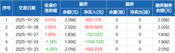 融资方面,当日融资买入2319.98万元,融资偿还1627.81万元,融资净买入692.17万元。融券方面,融券卖出0股,融券偿还0股,融券余量0股,融券余额0元。融资融券余额合计2.09亿元。
