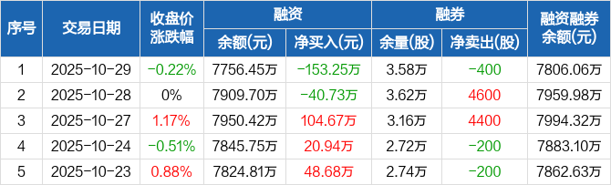 融资方面,当日融资买入423.85万元,融资偿还577.1万元,融资净偿还153.25万元。融券方面,融券卖出0股,融券偿还400股,融券余量3.58万股,融券余额49.62万元。融资融券余额合计7806.06万元。