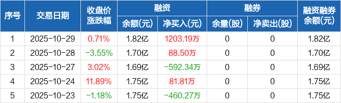 融资方面,当日融资买入5727.66万元,融资偿还4524.46万元,融资净买入1203.19万元。融券方面,融券卖出0股,融券偿还0股,融券余量0股,融券余额0元。融资融券余额合计1.82亿元。
