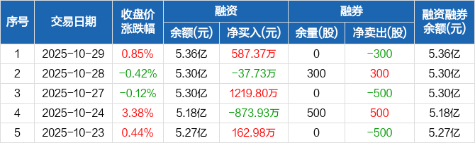 融资方面,当日融资买入2140.65万元,融资偿还1553.28万元,融资净买入587.37万元。融券方面,融券卖出0股,融券偿还300股,融券余量0股,融券余额0元。融资融券余额合计5.36亿元。