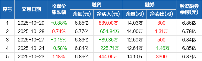 融资方面,当日融资买入1782.62万元,融资偿还943.62万元,融资净买入839万元。融券方面,融券卖出400股,融券偿还100股,融券余量14.03万股,融券余额95.26万元。融资融券余额合计6.86亿元。
