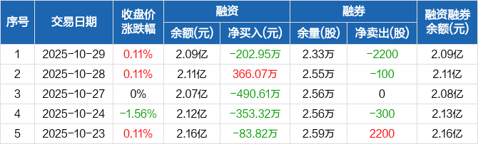 融资方面,当日融资买入573.72万元,融资偿还776.67万元,融资净偿还202.95万元。融券方面,融券卖出0股,融券偿还2200股,融券余量2.33万股,融券余额20.69万元。融资融券余额合计2.09亿元。