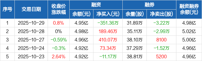 泰和新材融资融券信息显示,2025年10月29日融资净偿还351.36万元;融资余额4.95亿元,较前一日下降0.71%。