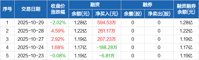 融资方面,当日融资买入2229.86万元,融资偿还1635.34万元,融资净买入594.53万元,连续3日净买入累计1062.93万元。融券方面,融券卖出0股,融券偿还0股,融券余量0股,融券余额0元。融资融券余额合计1.28亿元。