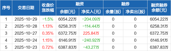 融资方面,当日融资买入267.58万元,融资偿还471.67万元,融资净偿还204.09万元。融券方面,融券卖出0股,融券偿还0股,融券余量0股,融券余额0元。融资融券余额合计6054.22万元。