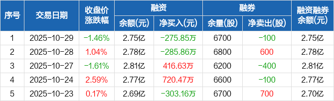 融资方面,当日融资买入1850.13万元,融资偿还2125.98万元,融资净偿还275.85万元。融券方面,融券卖出0股,融券偿还100股,融券余量6700股,融券余额12.24万元。融资融券余额合计2.75亿元。