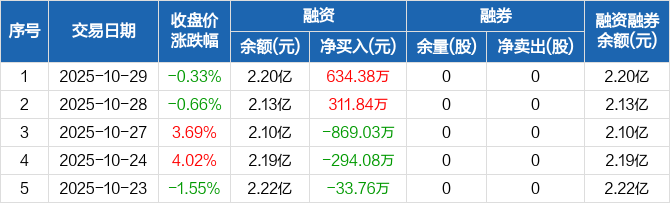 珠城科技融资融券信息显示,2025年10月29日融资净买入634.38万元;融资余额2.2亿元,较前一日增加2.97%。