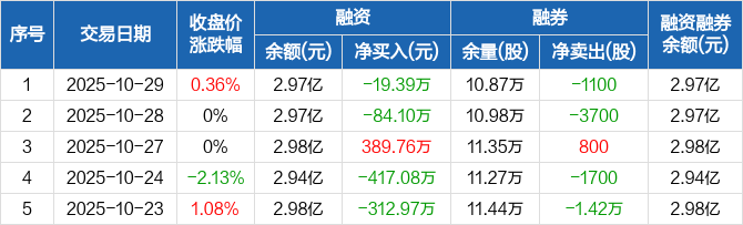 融资方面,当日融资买入1575.32万元,融资偿还1594.71万元,融资净偿还19.39万元。融券方面,融券卖出900股,融券偿还2000股,融券余量10.87万股,融券余额30.11万元。融资融券余额合计2.97亿元。