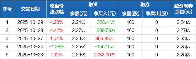 融资方面,当日融资买入7050.57万元,融资偿还7378.98万元,融资净偿还328.41万元。融券方面,融券卖出0股,融券偿还0股,融券余量100股,融券余额1280元。融资融券余额合计2.24亿元。