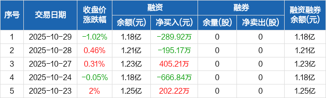 融资方面,当日融资买入466.54万元,融资偿还756.46万元,融资净偿还289.92万元。融券方面,融券卖出0股,融券偿还0股,融券余量0股,融券余额0元。融资融券余额合计1.18亿元。