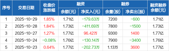 融资方面,当日融资买入1045.11万元,融资偿还1224.74万元,融资净偿还179.63万元。融券方面,融券卖出1000股,融券偿还1600股,融券余量7200股,融券余额17.88万元。融资融券余额合计1.71亿元。