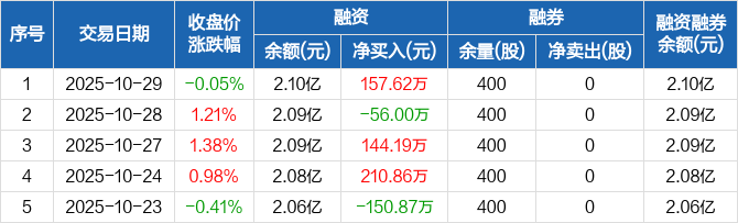融资方面,当日融资买入1207.48万元,融资偿还1049.86万元,融资净买入157.62万元。融券方面,融券卖出0股,融券偿还0股,融券余量400股,融券余额8012元。融资融券余额合计2.1亿元。