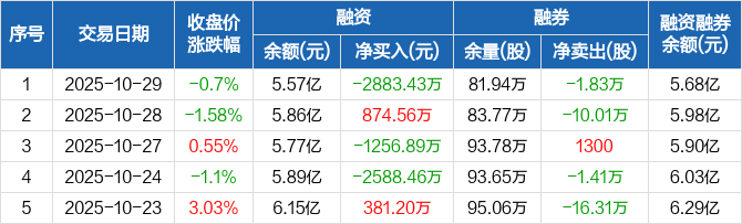 融资方面,当日融资买入3491.95万元,融资偿还6375.38万元,融资净偿还2883.43万元。融券方面,融券卖出100股,融券偿还1.84万股,融券余量81.94万股,融券余额1162.73万元。融资融券余额合计5.68亿元。