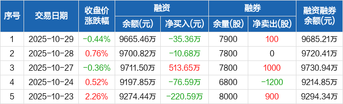 融资方面,当日融资买入342.12万元,融资偿还377.47万元,融资净偿还35.36万元。融券方面,融券卖出100股,融券偿还0股,融券余量7900股,融券余额19.75万元。融资融券余额合计9685.21万元。