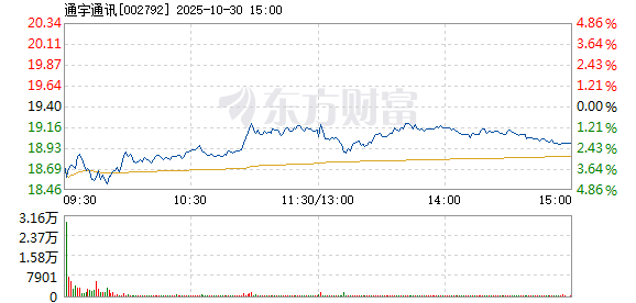 10月30日,通宇通讯开盘跌幅达5%,截至9点30分,报18.41元,成交2576.59万元,换手率0.41%。
