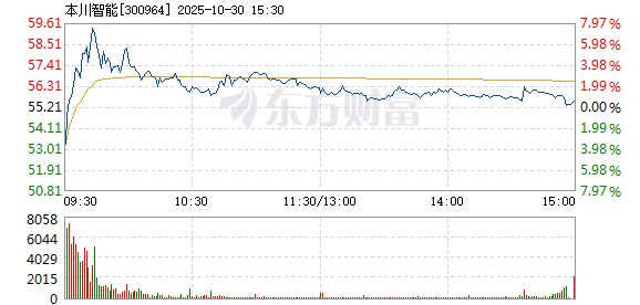 本川智能盘中快速回调,5分钟内跌幅超过2%,截至9点46分,报57.17元,成交4.45亿元,换手率14.27%。