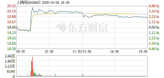 人民网盘中快速反弹,5分钟内涨幅超过2%,截至9点55分,报19.69元,成交3980.68万元,换手率0.19%。