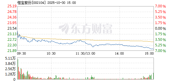 恒宝股份盘中跌幅达5%,截至13点04分,报22.36元,成交17.57亿元,换手率12.91%。