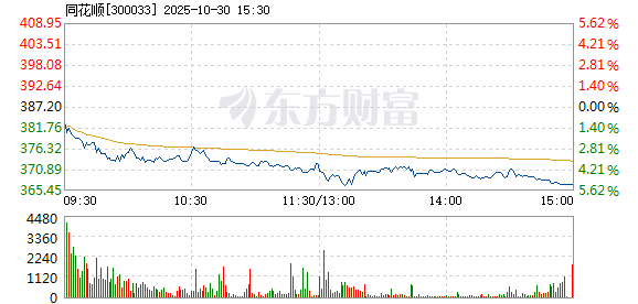 同花顺盘中跌幅达5%,截至13点04分,报367.41元,成交42.09亿元,换手率4.08%。