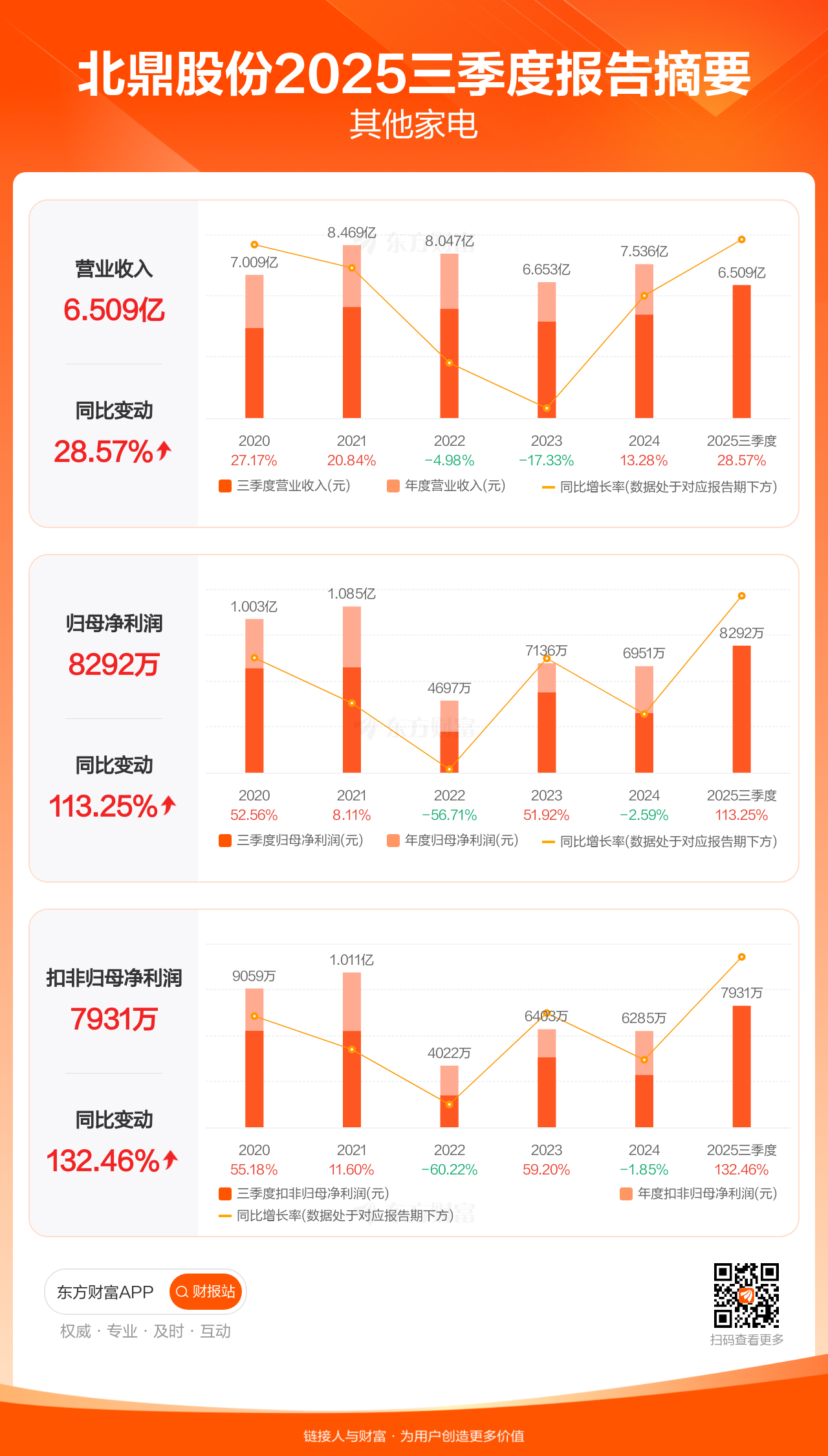 北鼎股份10月24日发布2025年三季报显示,公司前三季实现营业收入6.51亿元,同比增长28.57%;归母净利润8291.58万元,同比增长113.25%;扣非归母净利润7931.17万元,同比增长132.46%。