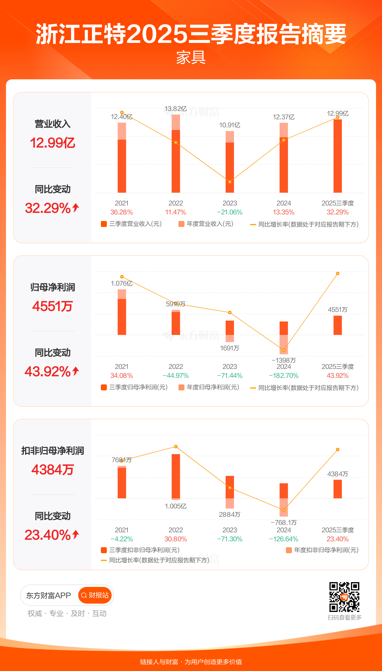 浙江正特10月31日发布2025年三季报显示,公司前三季实现营业收入12.99亿元,同比增长32.29%;归母净利润4551.01万元,同比增长43.92%;扣非归母净利润4384.11万元,同比增长23.40%。