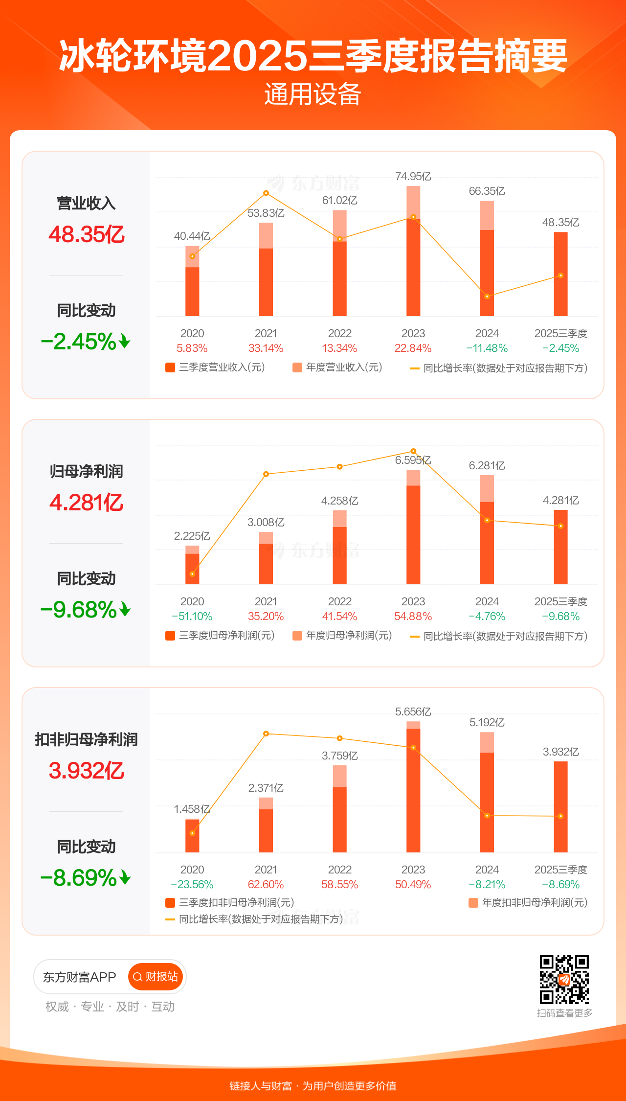 冰轮环境10月31日发布2025年三季报显示,公司前三季实现营业收入48.35亿元,同比下滑2.45%;归母净利润4.28亿元,同比下滑9.68%;扣非归母净利润3.93亿元,同比下滑8.69%。