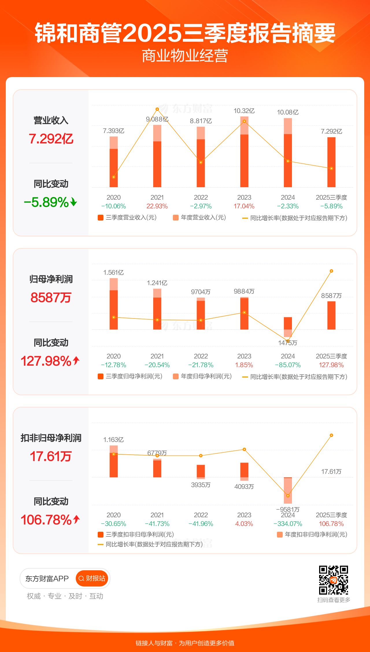 锦和商管10月31日发布2025年三季报显示,公司前三季实现营业收入7.29亿元,同比下滑5.89%;归母净利润8586.88万元,同比增长127.98%;扣非归母净利润17.61万元,同比增长106.78%。