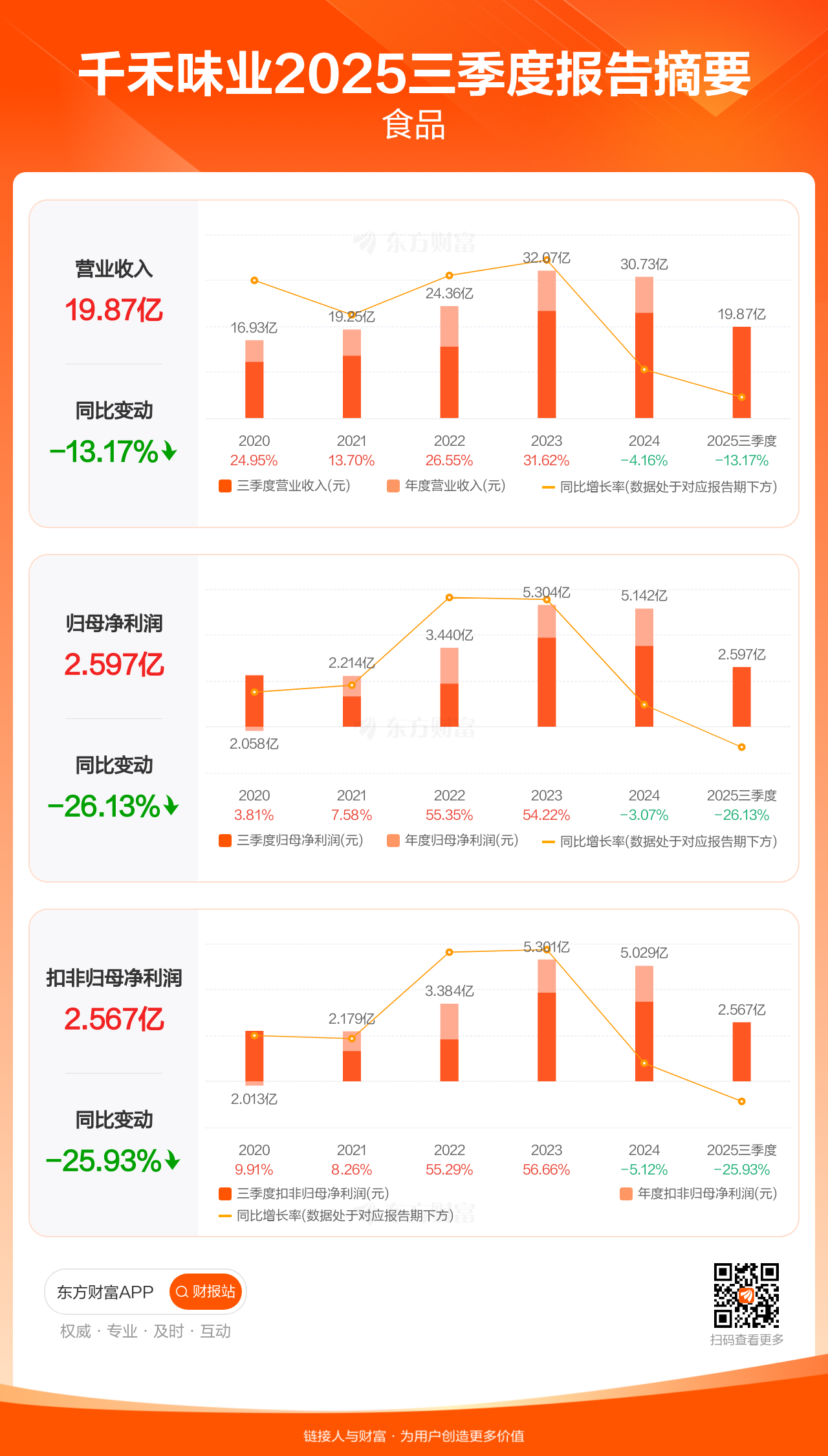 千禾味业10月31日发布2025年三季报显示,公司前三季实现营业收入19.87亿元,同比下滑13.17%;归母净利润2.60亿元,同比下滑26.13%;扣非归母净利润2.57亿元,同比下滑25.93%。