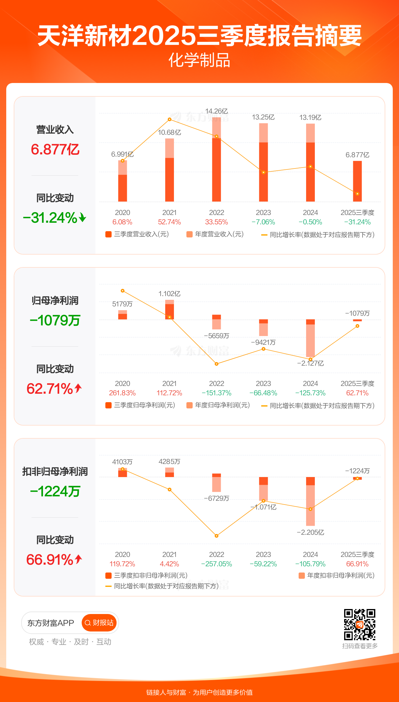 天洋新材10月31日发布2025年三季报显示,公司前三季实现营业收入6.88亿元,同比下滑31.24%;归母净利润-1079.16万元;扣非归母净利润-1224.21万元。