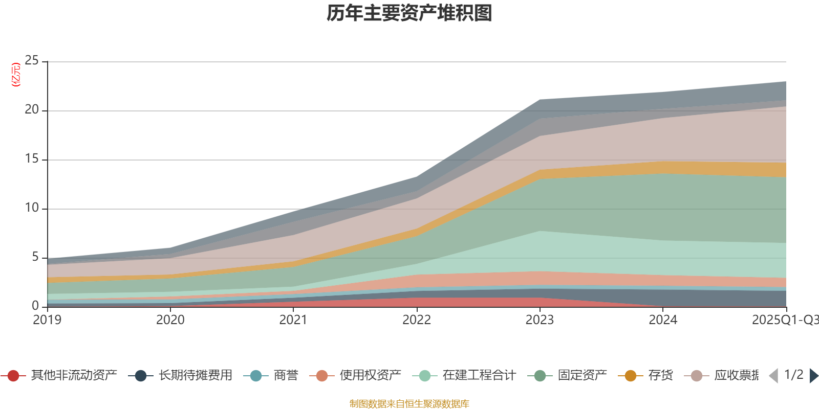 资产重大变化方面,截至2025年三季度末,公司应收票据及应收账款较上年末增加30.68%,占公司总资产比重上升4.91个百分点;固定资产较上年末减少1.9%,占公司总资产比重下降2.04个百分点;货币资金较上年末减少35.22%,占公司总资产比重下降1.66个百分点;长期待摊费用较上年末减少7.07%,占公司总资产比重下降0.89个百分点。