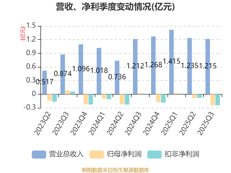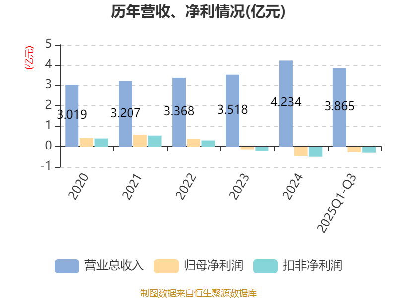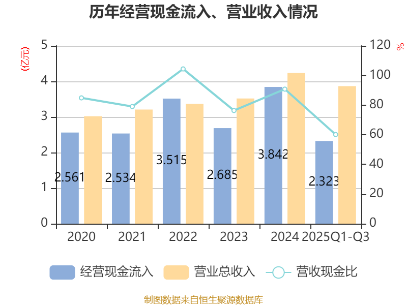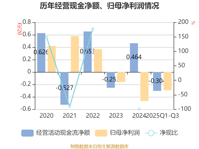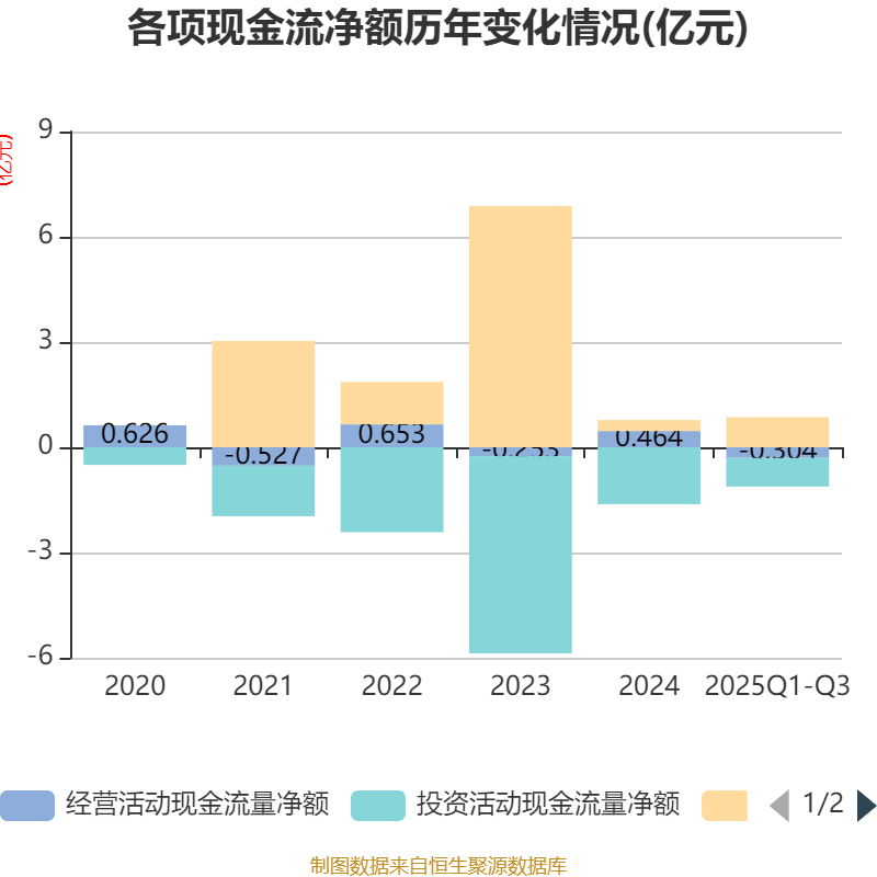 2025年前三季度,公司经营活动现金流净额为-3042.63万元,同比减少3620.53万元;筹资活动现金流净额8546.97万元,同比增加4500.02万元;投资活动现金流净额-8157.13万元,上年同期为-1.16亿元。