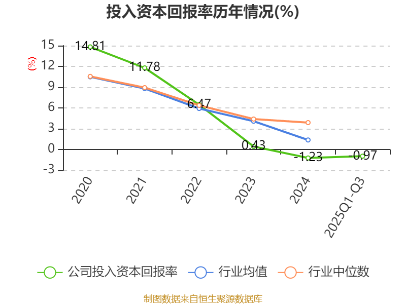 盈利能力方面, 2025年前三季度公司加权平均净资产收益率为-1.79%,同比上升1.1个百分点。公司2025年前三季度投入资本回报率为-0.97%,较上年同期下降0.2个百分点。