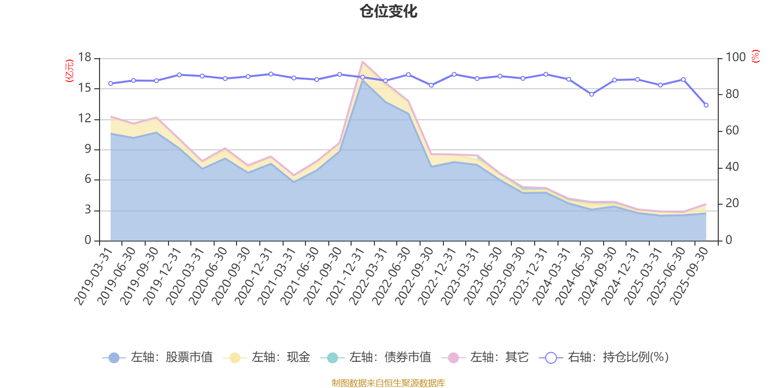 据定期报告数据统计,近三年平均股票仓位为86.94%,同类平均为72.35%。2020年末基金达到91.33%的最高仓位,2025年三季度末最低,为74.25%。