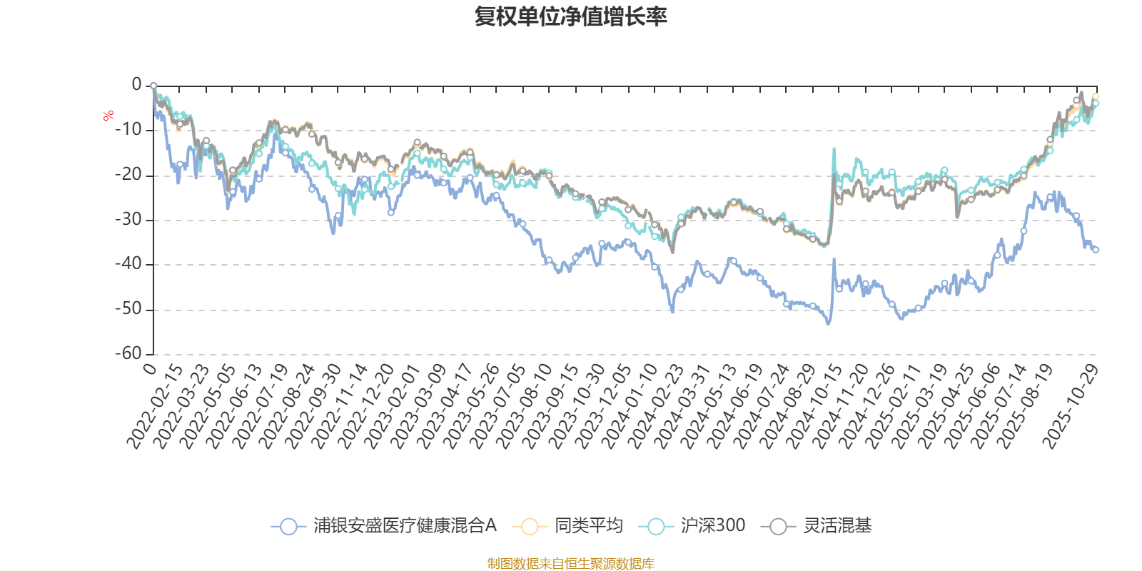 截至10月29日,浦银安盛医疗健康混合A近三个月复权单位净值增长率为-17.09%,位于同类可比基金1287/1287;近半年复权单位净值增长率为13.73%,位于同类可比基金953/1287;近一年复权单位净值增长率为14.02%,位于同类可比基金875/1287;近三年复权单位净值增长率为-15.97%,位于同类可比基金1212/1286。