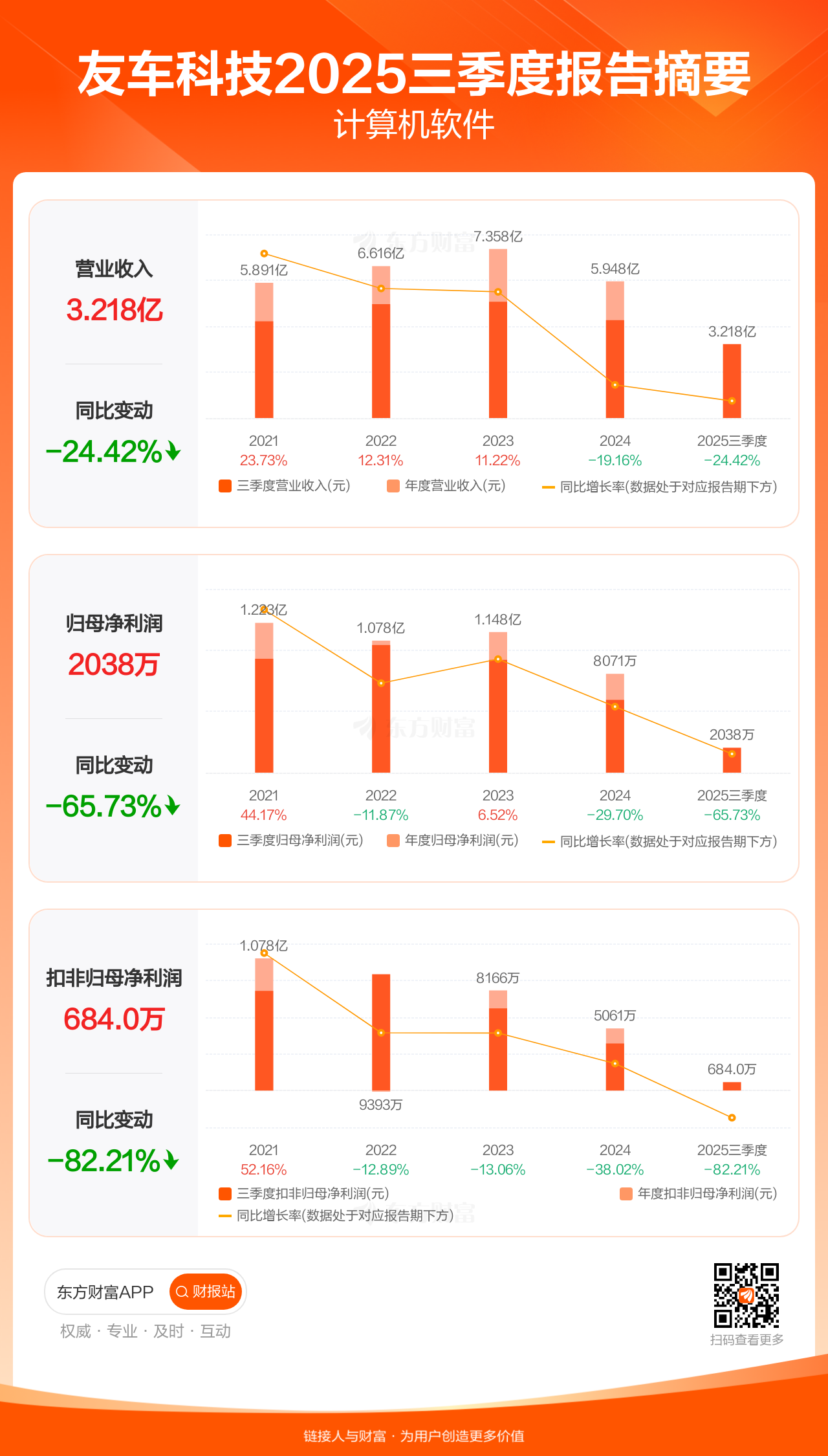 友车科技10月31日发布2025年三季报显示,公司前三季实现营业收入3.22亿元,同比下滑24.42%;归母净利润2038.08万元,同比下滑65.73%;扣非归母净利润683.96万元,同比下滑82.21%。